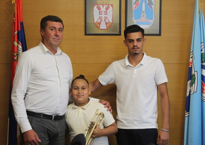 Председник општине Братислав Петровић примио је двојицу трубача из Власотинца, који су на Сабору у Гучи пре неколико дана освојили награде: једанаестогодишњег Матеју Станисављевића, најбољег трубача омладинца и Давида Антића, чији је оркестар освојио друго место 62. Драгачевском сабору. Матеја је испричао да трубу свира од треће године и да ће сада да упише и музичку школу. -А планирам и факултет да завршим – није крио амбиције најбољи млади трубач овогодишњег сабора у Гучи. Отац Милош каже да су трубе утихнуле, али славље није, а мајка Надица додаје да Матеја „свира“ и док спава. -Прсти му стално „раде“ – каже. Давид је рекао да је у Гучи већ 10 година присутан са дедом, познатим трубачем Божидаром Николићем Доњом. -Почињу припреме за наредну годину, учествоваћу и даље у Гучи – открио је Давид планове и додао да га чека пут у Бугарску, у Пловдив, где ће наступати. Председник општине Братислав Петровић честитао им је на изванредним резултатима. -Осим што сте представили себе, свој оркестар и породице, ви сте много допринели и промоцији нашег Власотинца. Веома је значајно што се на проглашењу победника, на највећем светском сабору трубача, два пута чуло име Власотинца и хвала вам на томе – рекао је Петровић. Давид и Матеја потврдили су да им се живот прилично променио од Гуче, посла је више, а и медијских наступа.