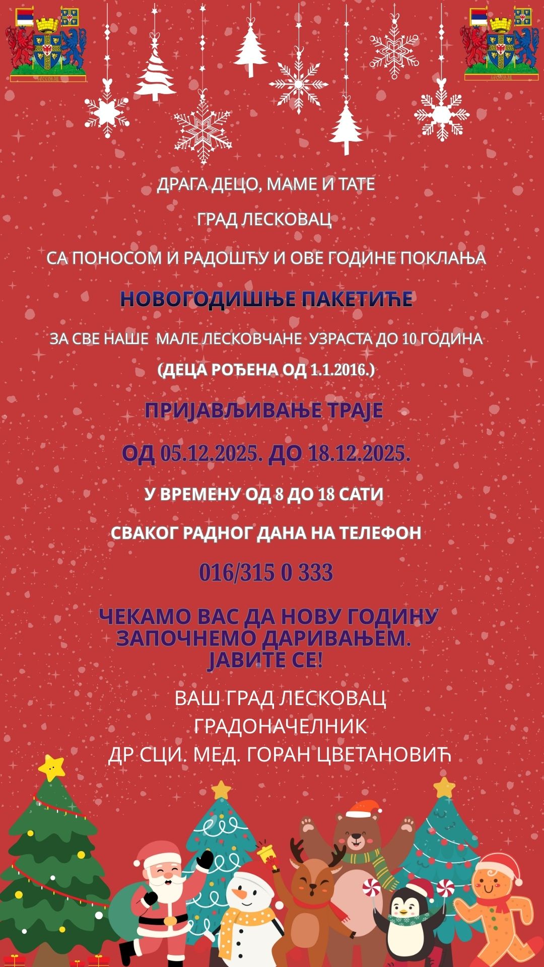 Град Лесковац са поносом и радошћу и ове године поклања новогодишње пакетиће за све мале Лесковчане узраста до 10 година, односно деци рођеној од 01. 01. 2016. године, а која имају пребивалиште на територији града.